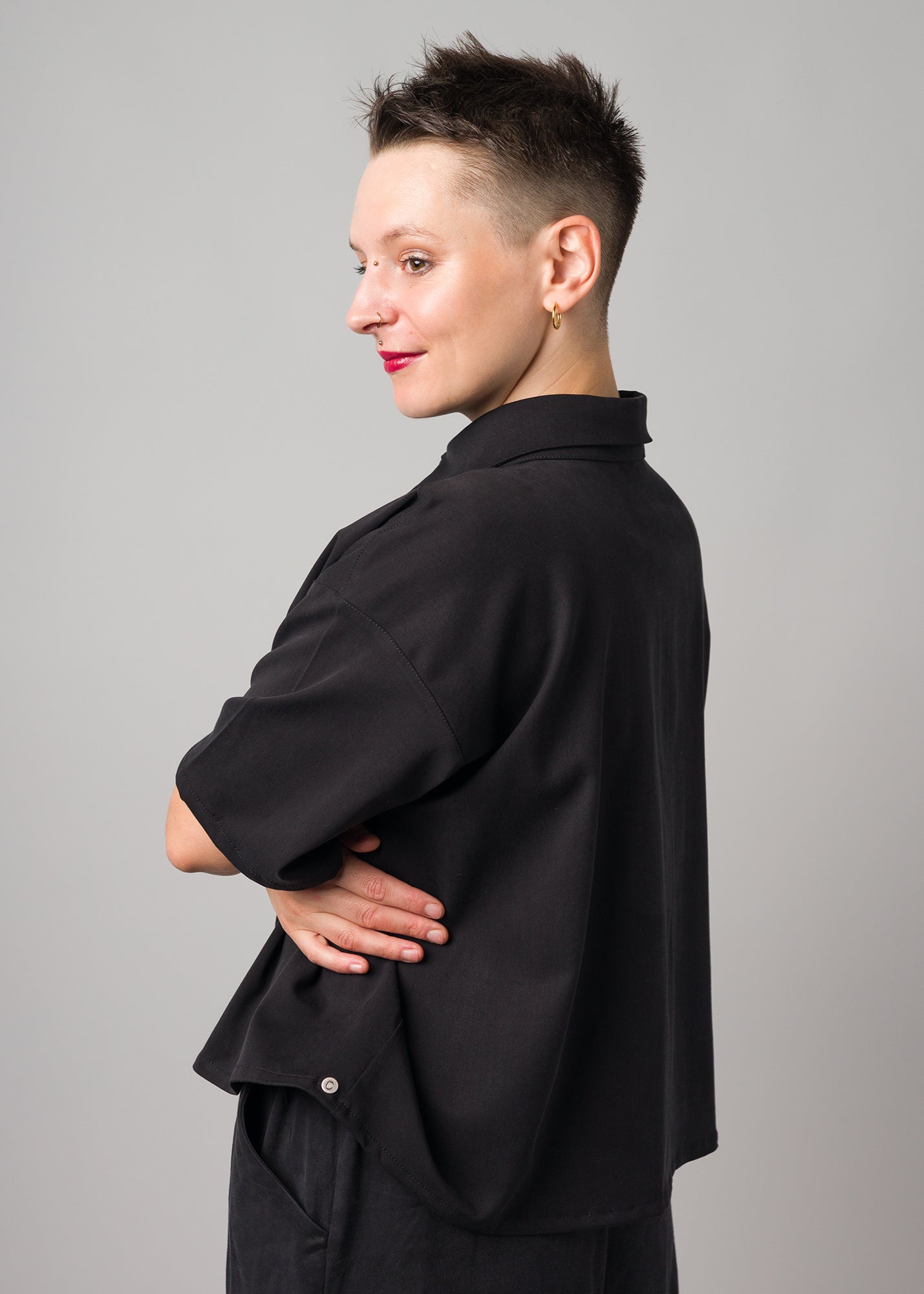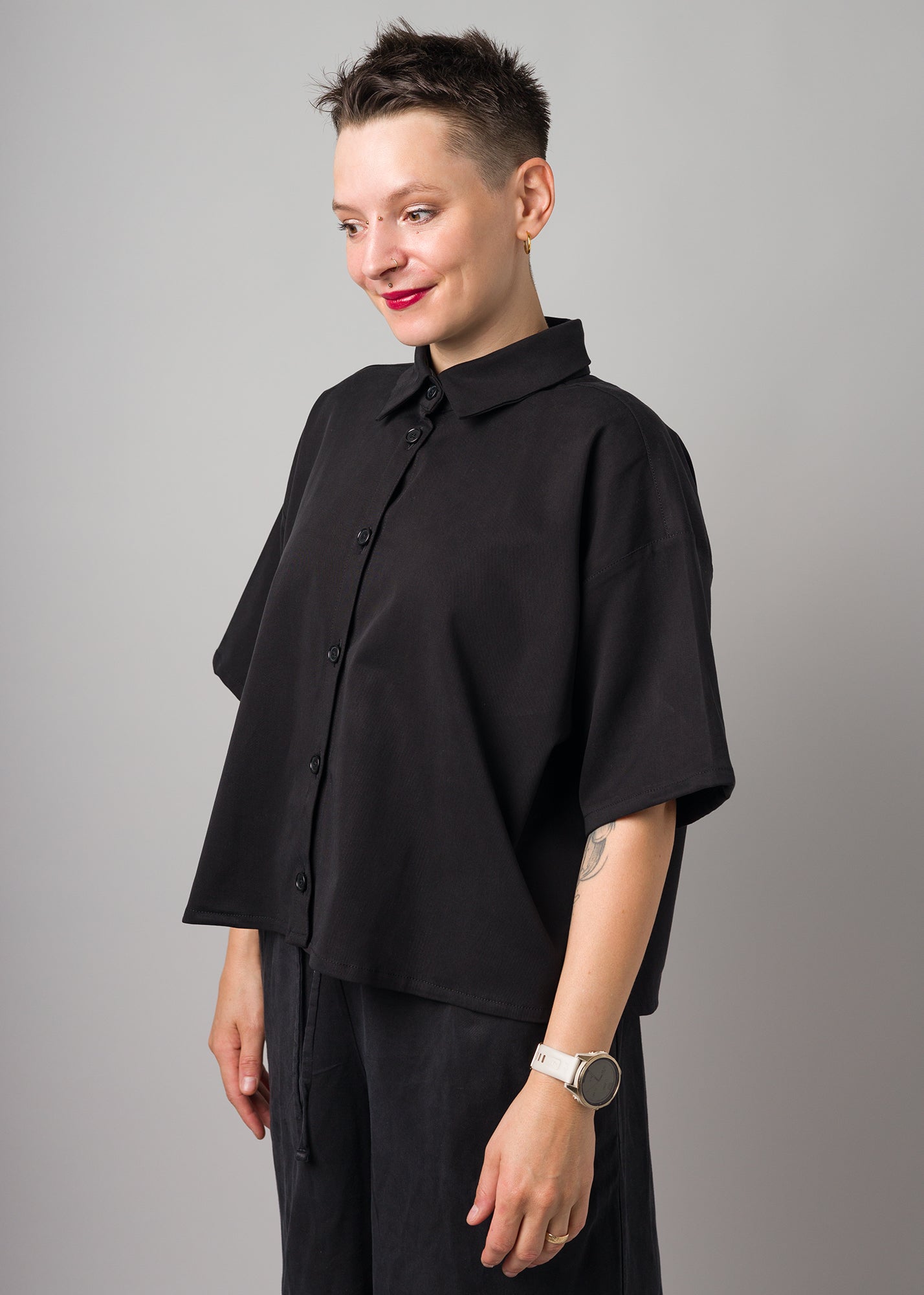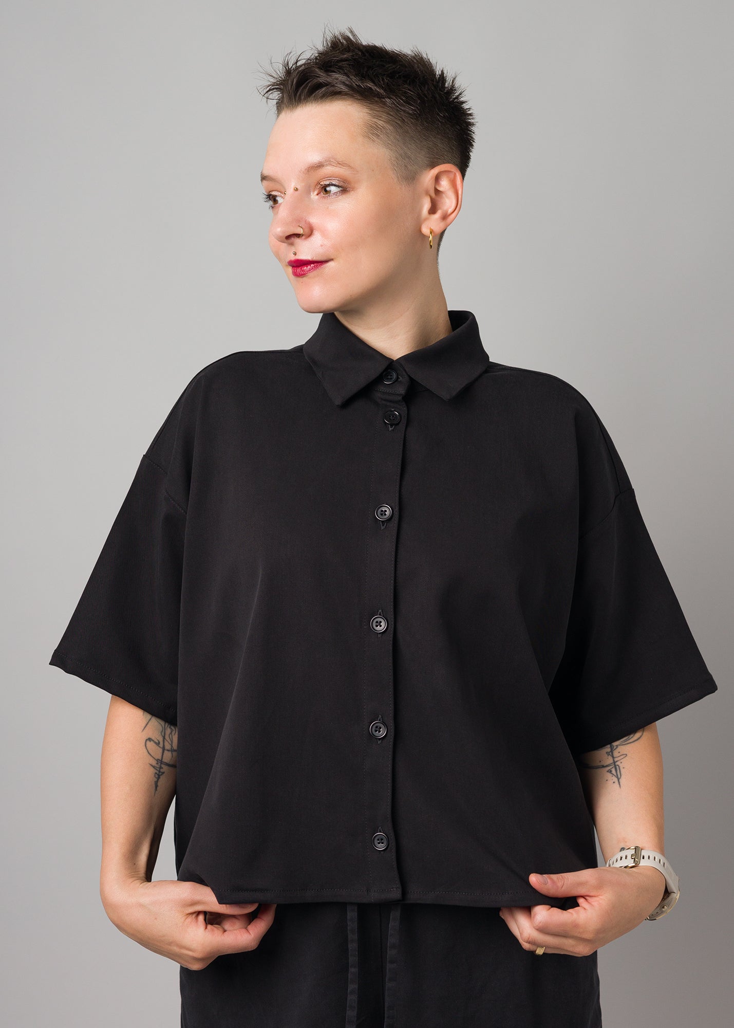 Oversized und kurz geschnittene Bluse mit Knopfleiste, Kragen.