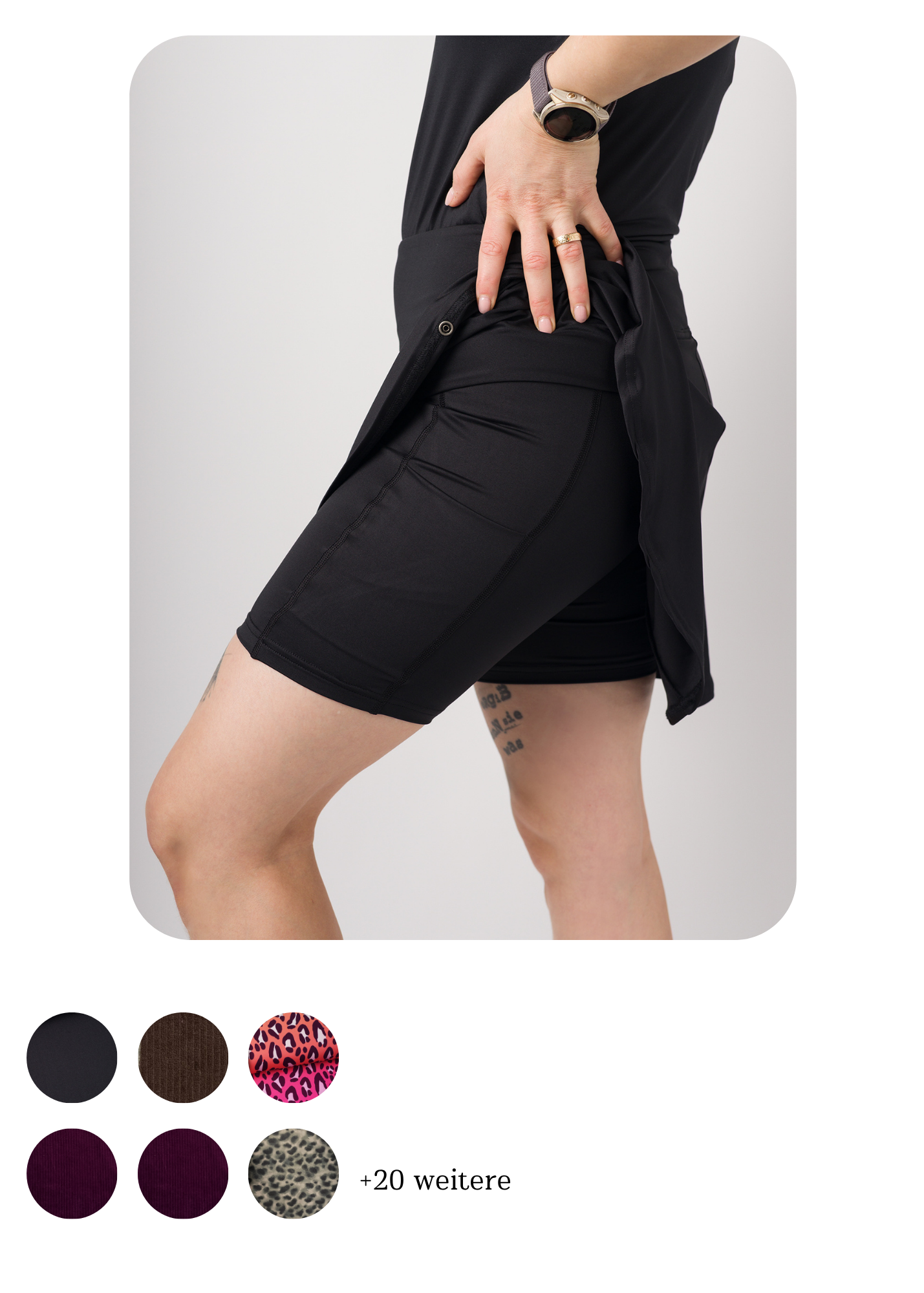Rock mit integrierter Radlershorts mit hohem und bequemem Bund, Flachnähten und Außentaschen an beiden Oberschenkeln zum Verstauen von Smartphone, Taschentüchern, Schlüssel oder Karte.